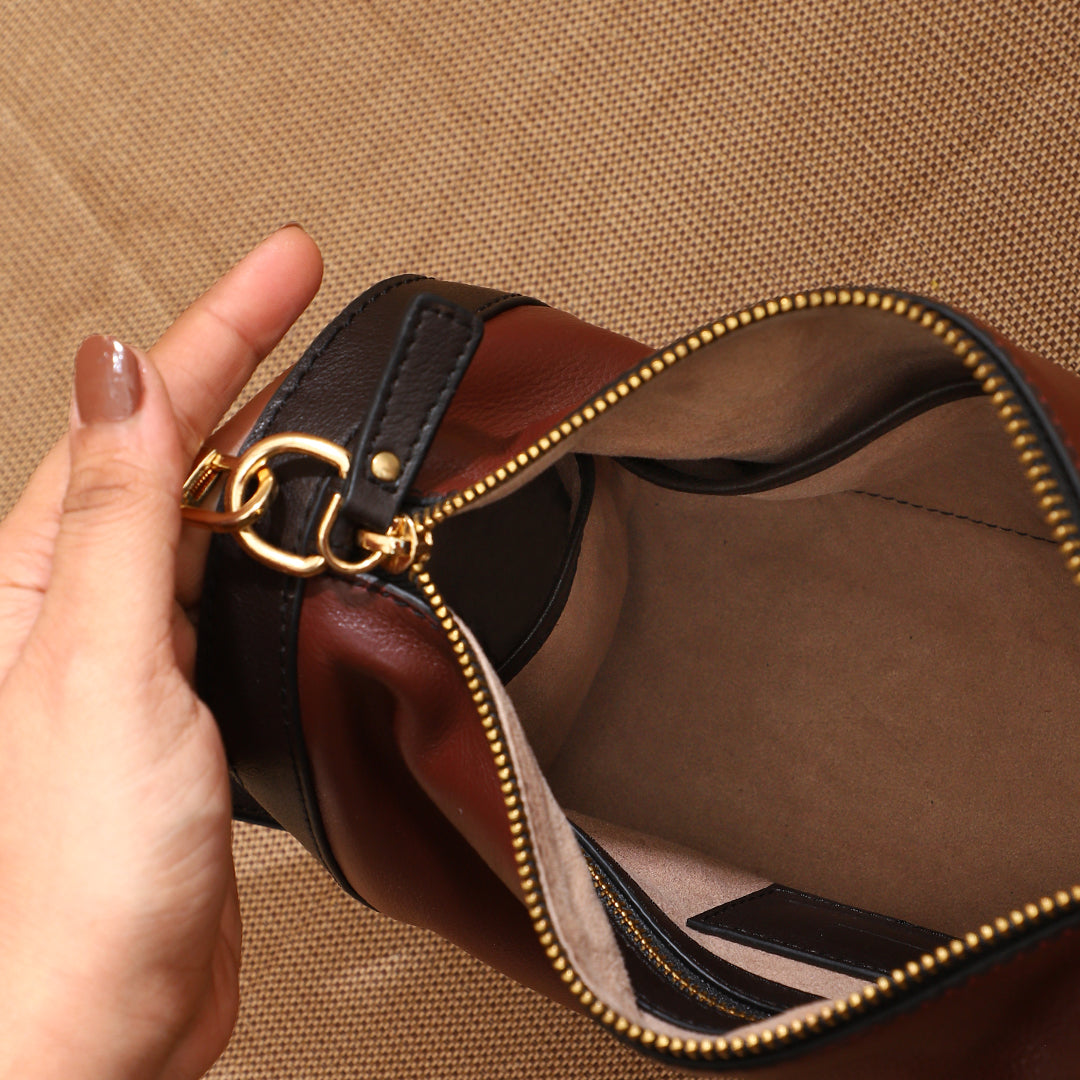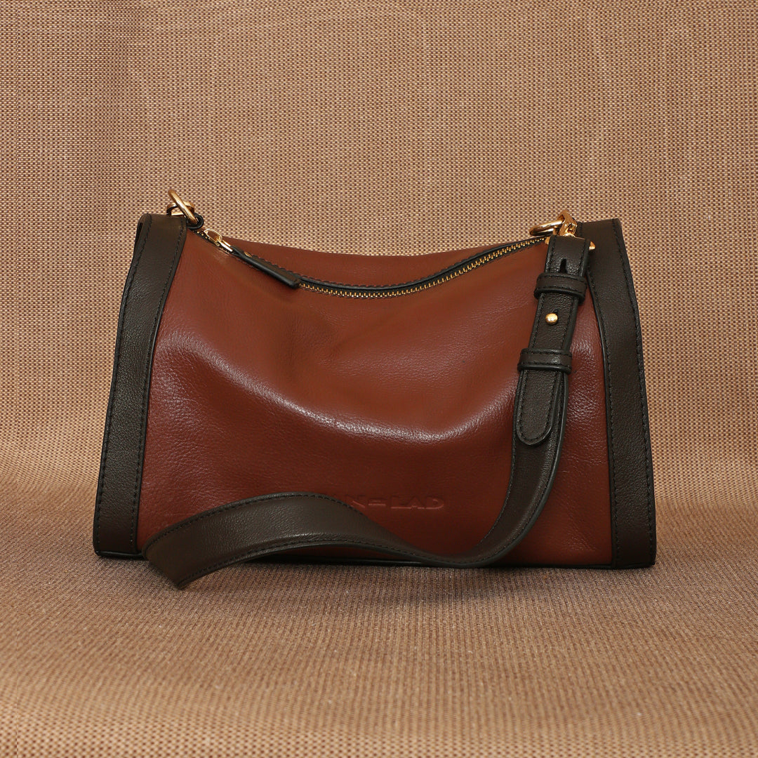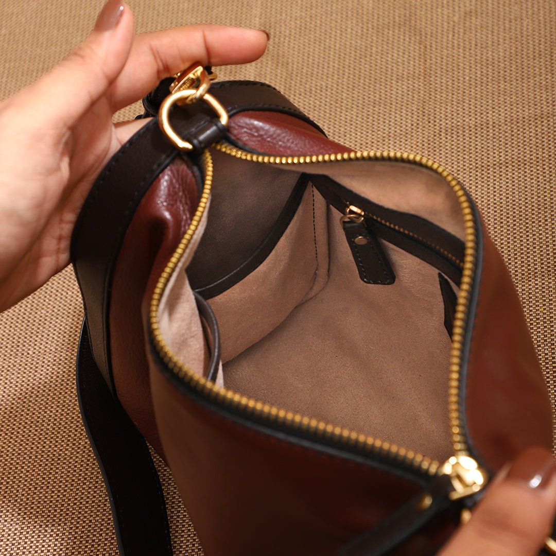 Crafted with gorgeous Cherry and Ganache leather, this bag features a zipper closure, ensuring the safety of your essentials while still offering easy access. The spacious main compartment allows for ample storage, perfect for your daily must-haves.