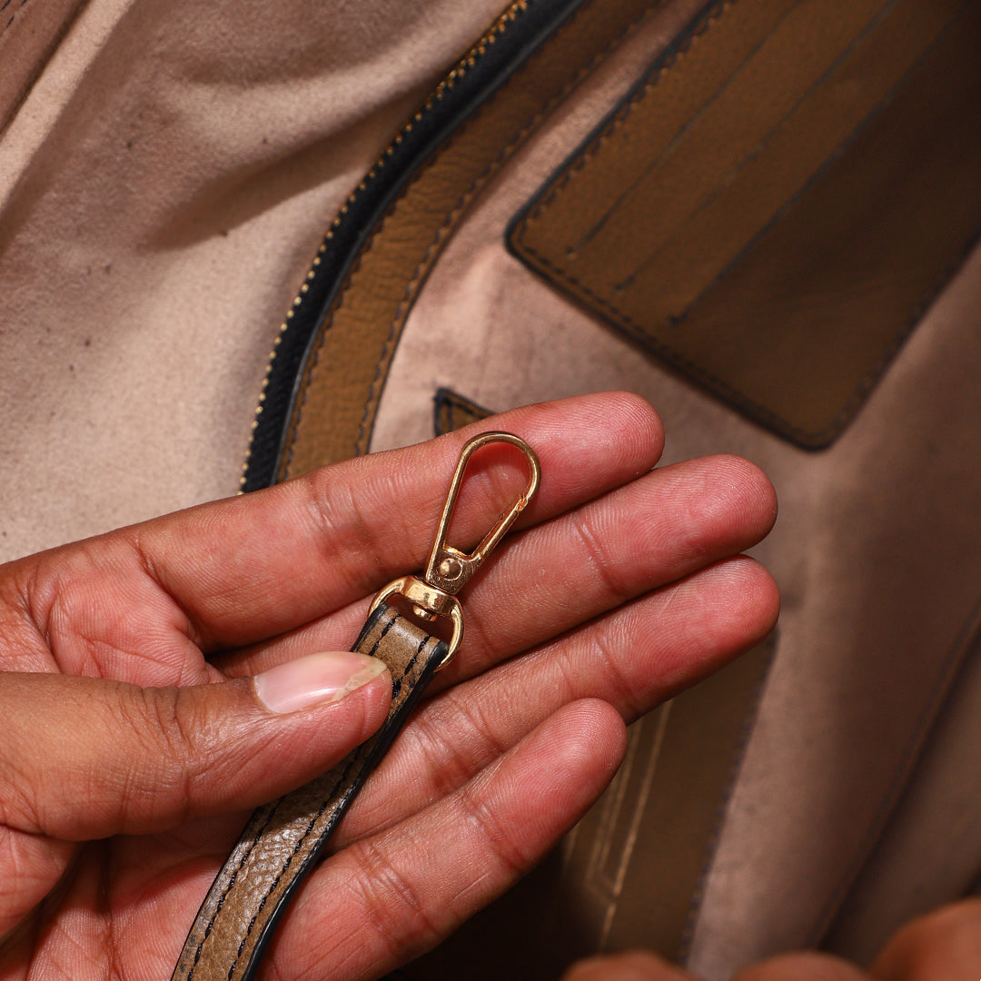 Crafted with gorgeous Ganache and Cork leather, it features a durable 2-way zipper closure, providing easy access and security. The rounded grab handles offer a comfortable carry option, while the adjustable and detachable shoulder strap with a padded shoulder pad ensures versatility and comfort, whether you're commuting or traveling.
